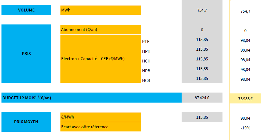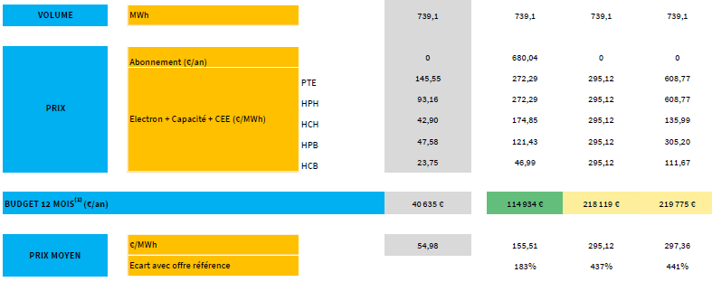 Au beau milieu de la crise des prix de l’électricité (août 2022), période pendant laquelle les prix futures de l’électricité ont atteints des sommets (> 1000 €/MWh), il était possible de dénicher des offres de prix sur 3 ans dont le prix moyen était de 155 €/MWh. Ce prix est bien en-dessous du prix dont bénéficiait le client avant de contrat (55 €/MWh), mais il reste quand même en-dessous du plafond du premier amortisseur défini par l’état permettant aux entreprises de se faire rembourser la moitié de leur facture au-dessus de 180 €/MWh. Au même moment, les offres des autres fournisseurs consultés paraissent bien plus hautes (295 €/MWh et 297 €/MWh).