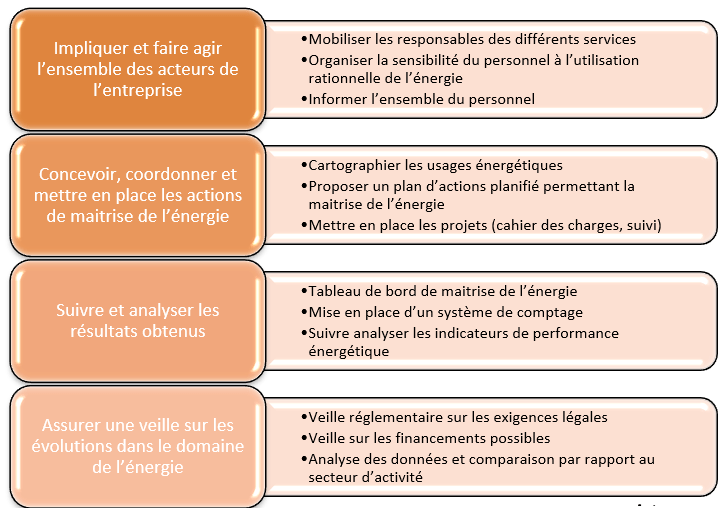 Le référent énergie, de formation énergie ou ayant des expériences significatives dans l’énergie, est en relation avec le responsable QSE et les opérationnels de l’entreprise (production/maintenance) pour la mise en place des actions de maitrise de l’énergie, en fonction de la culture d’entreprise insufflée par la direction.