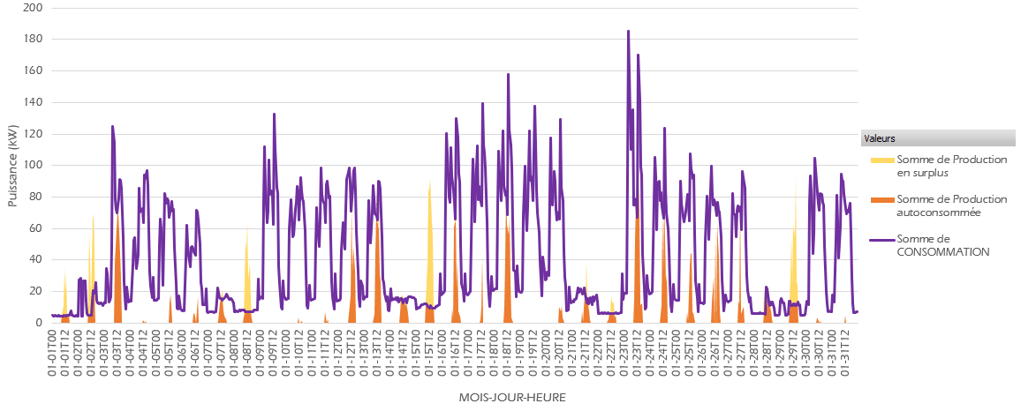 Le graphique à la maille horaire de l’étude d’opportunité de ce projet solaire en autoconsommation collective pour un industriel montre que sa production n’est pas totalement autoconsommée pendant le mois de janvier. En effet, les consommations pendant les WE et jours fériés, qui ne sont pas travaillés, sont en-deça de la production ; il y a donc de la production en surplus qui peut :